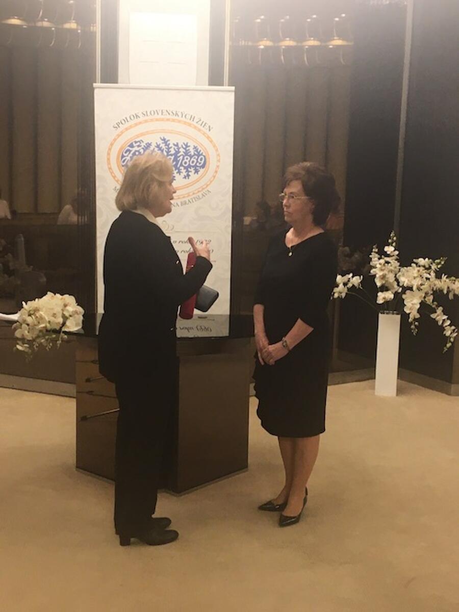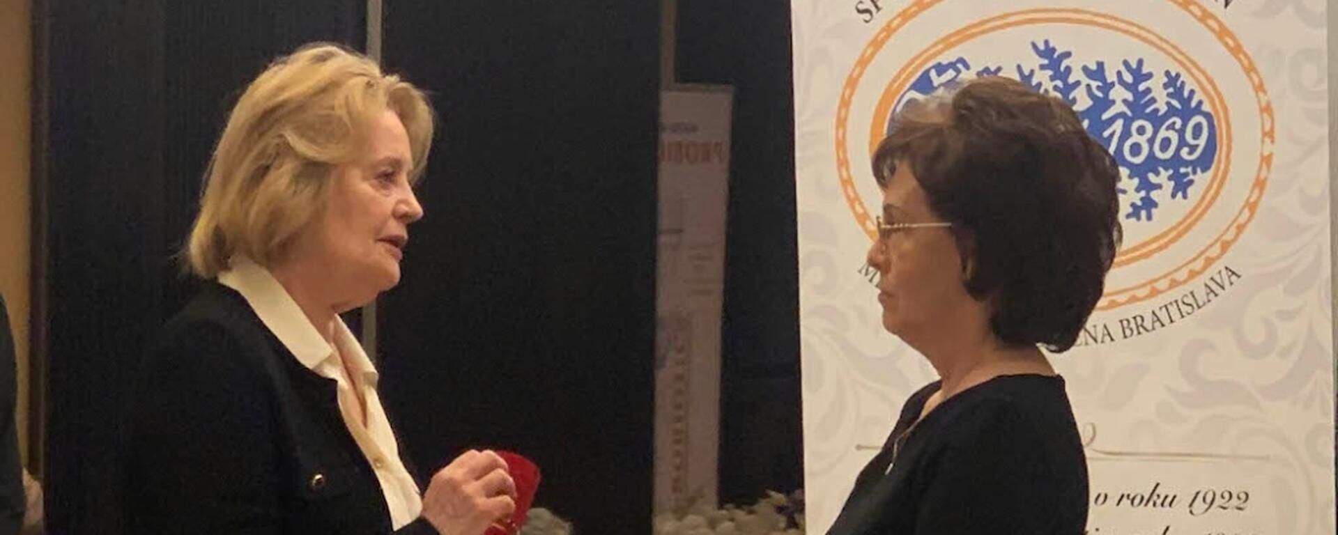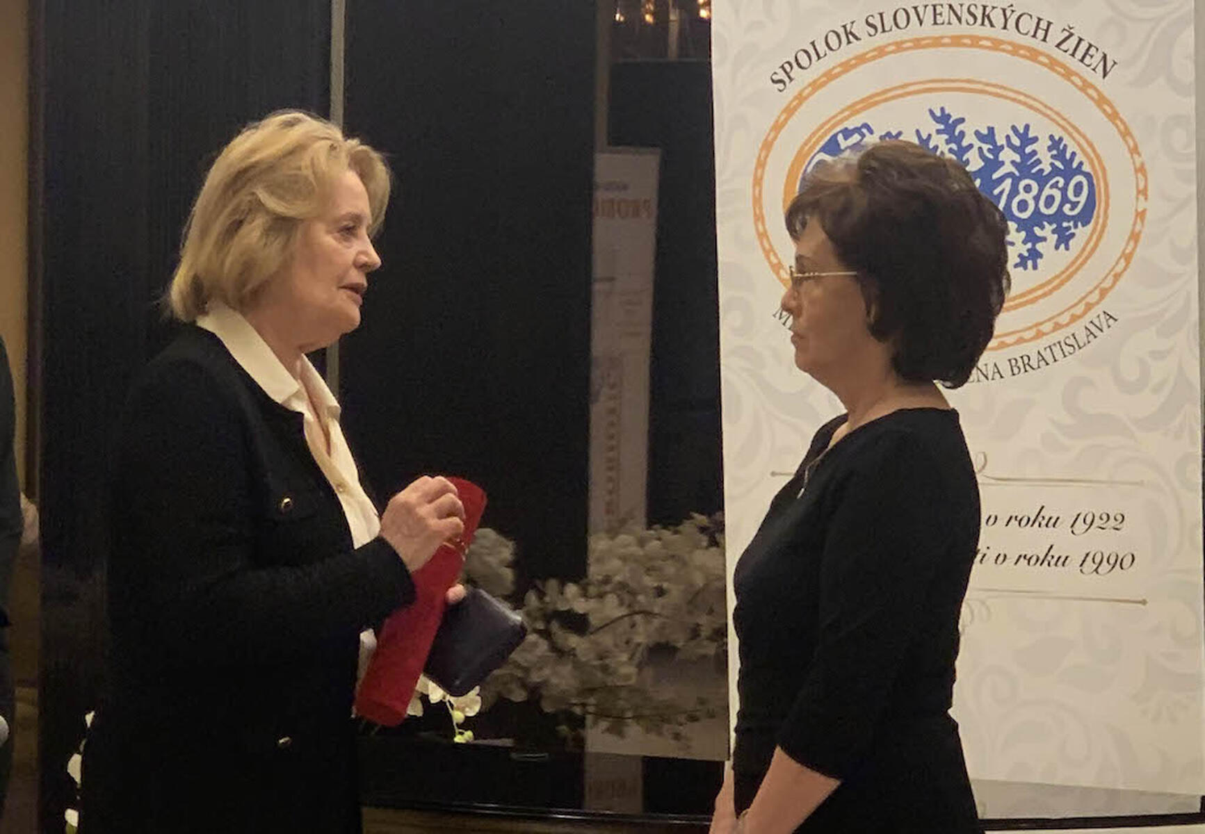 Prof. Mikolášová si ocenenie prevzala z rúk čestnej predsedníčky spolku, Magdy Vášáryovej. Tento moment symbolicky spojil odkaz historickej osobnosti a súčasného ženského líderstva.