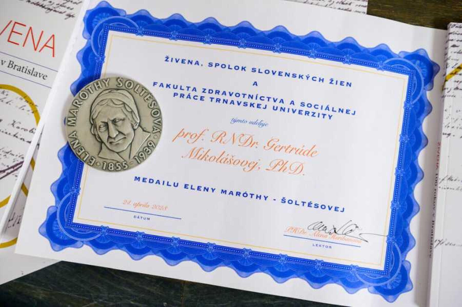 Prof. RNDr. Gertrúda Mikolášová, PhD., z Vysokej školy sv. Alžbety získala Medailu Eleny Maróthy Šoltésovej za obetavú prácu v sociálnej oblasti, ktorú jej odovzdala Magda Vášáryová.