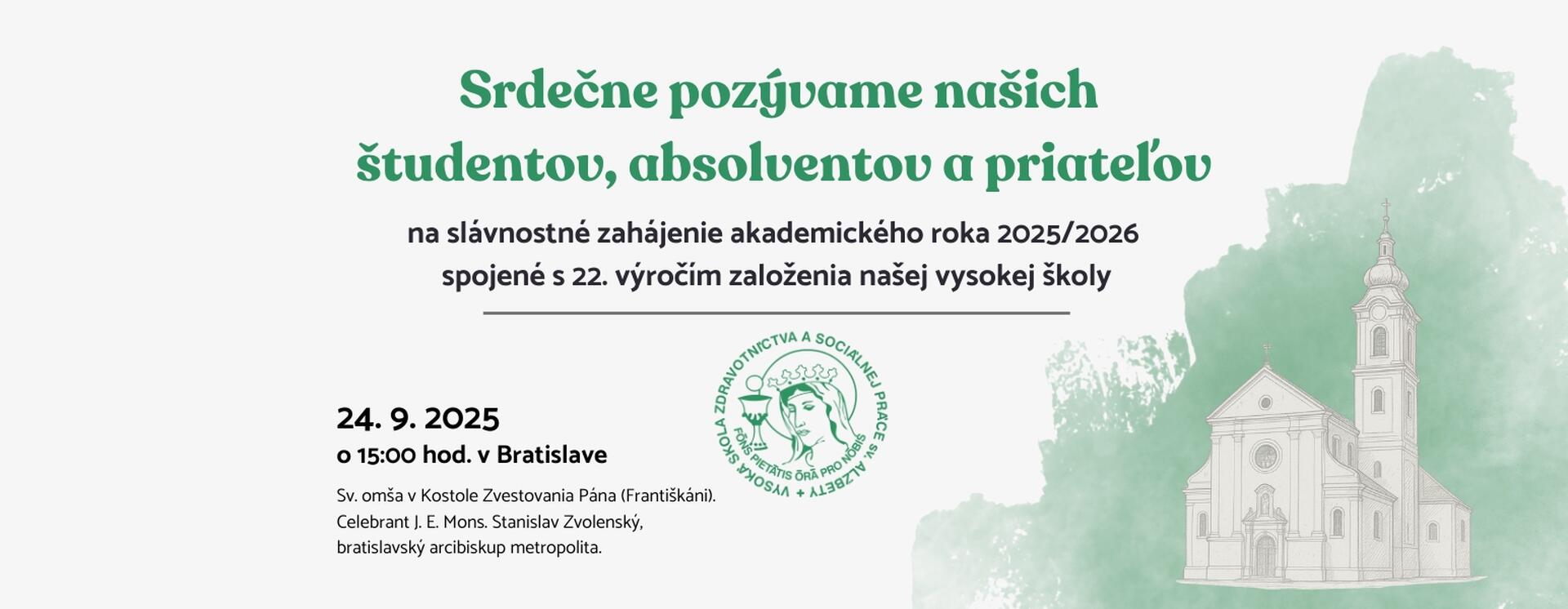 Srdečne pozývame študentov, absolventov a priateľov našej univerzity na slávnostné otvorenie akademického roka 2025/2026, ktoré bude zároveň pripomienkou 22. výročia založenia Vysokej školy zdravotníctva a sociálnej práce sv. Alžbety v Bratislave.