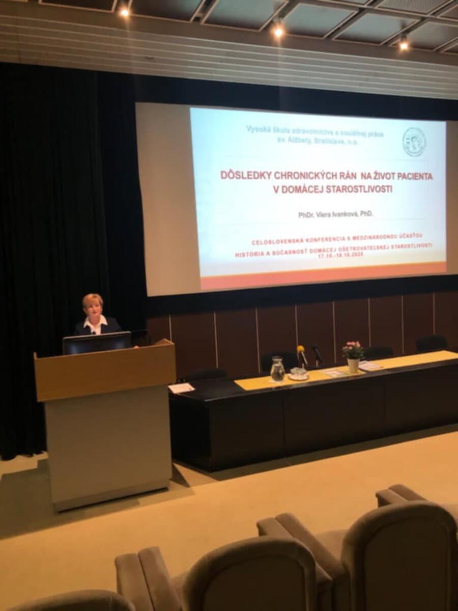 V rámci odborného programu vystúpila aj naša vyučujúca PhDr. Viera Ivanková, PhD., ktorá vo vyžiadanej prednáške predstavila tému „Dôsledky chronických rán na život pacienta v domácom prostredí.“