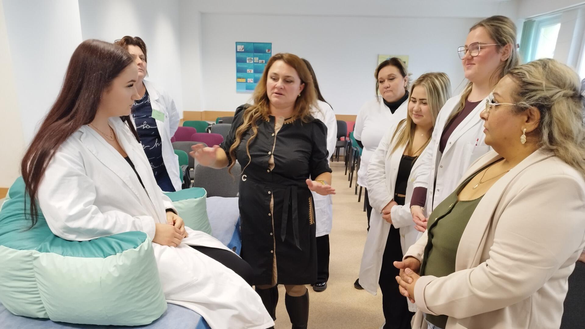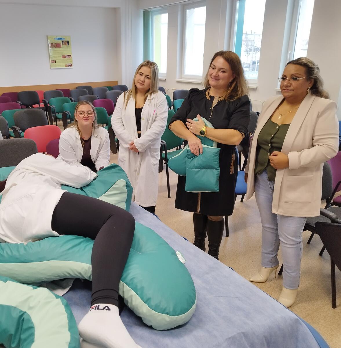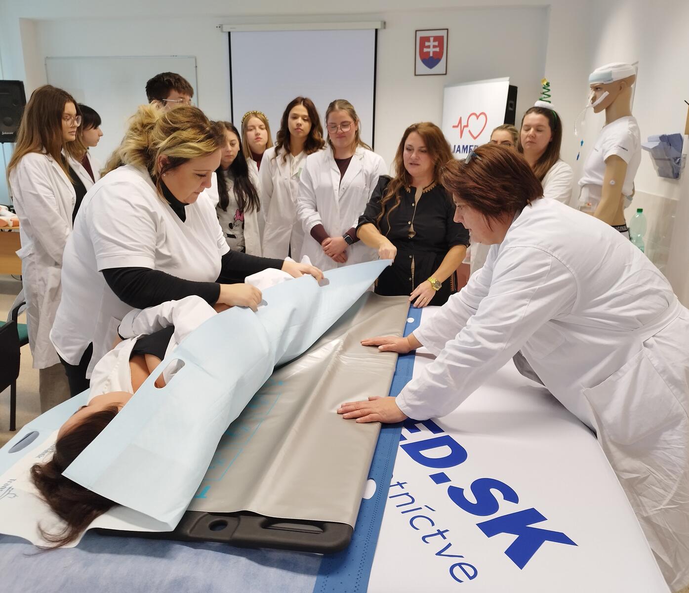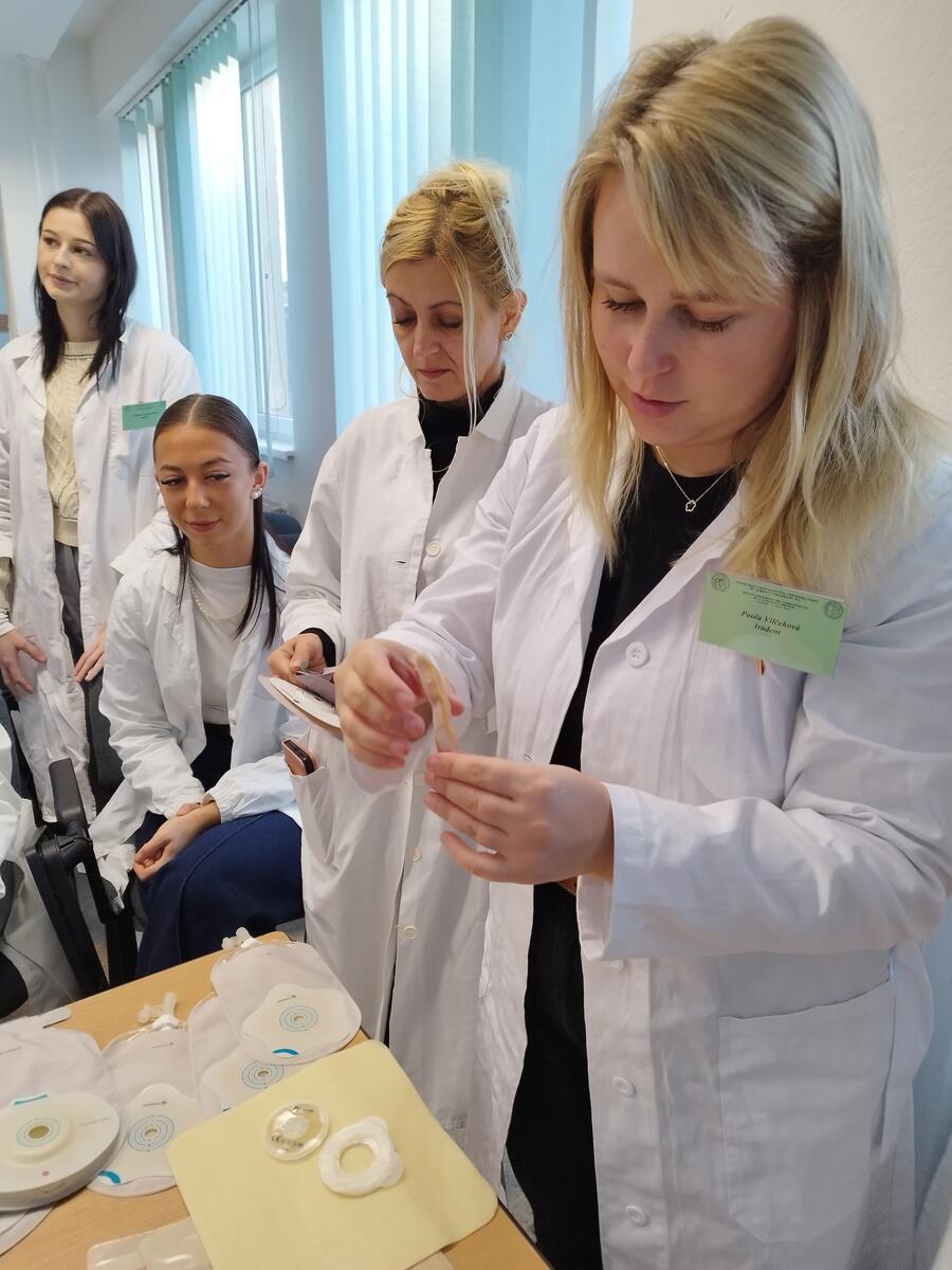 Poslucháči 1. ročníka bakalárskeho štúdia ošetrovateľstva sa 17. decembra 2025 spolu so svojimi mentorkami v priestoroch školy zúčastnili inovatívnej formy výučby praxe. Odborní reprezentanti firiem prezentujúcich zdravotnícke pomôcky a školitelia produktových portfólií im postupne predstavili zdravotnícke pomôcky uľahčujúce ošetrovateľskú starostlivosť o pacientov. Študenti mali priestor získať nielen teoretické vedomosti, ale aj skúsenosti a zručnosti z oblasti ošetrovania stómii, výživového poradenstva, obsluhy technických zariadení pre ľudí s obmedzenou pohyblivosťou a polohovania ako účinnej stratégie prevencie vzniku dekubitov. Ďakujeme všetkým, ktorí prispeli k obohacujúcemu podujatiu na podporu vzdelávania, získaniu zručností a tým zvýšeniu kvality pri poskytovaní odbornej starostlivosti.