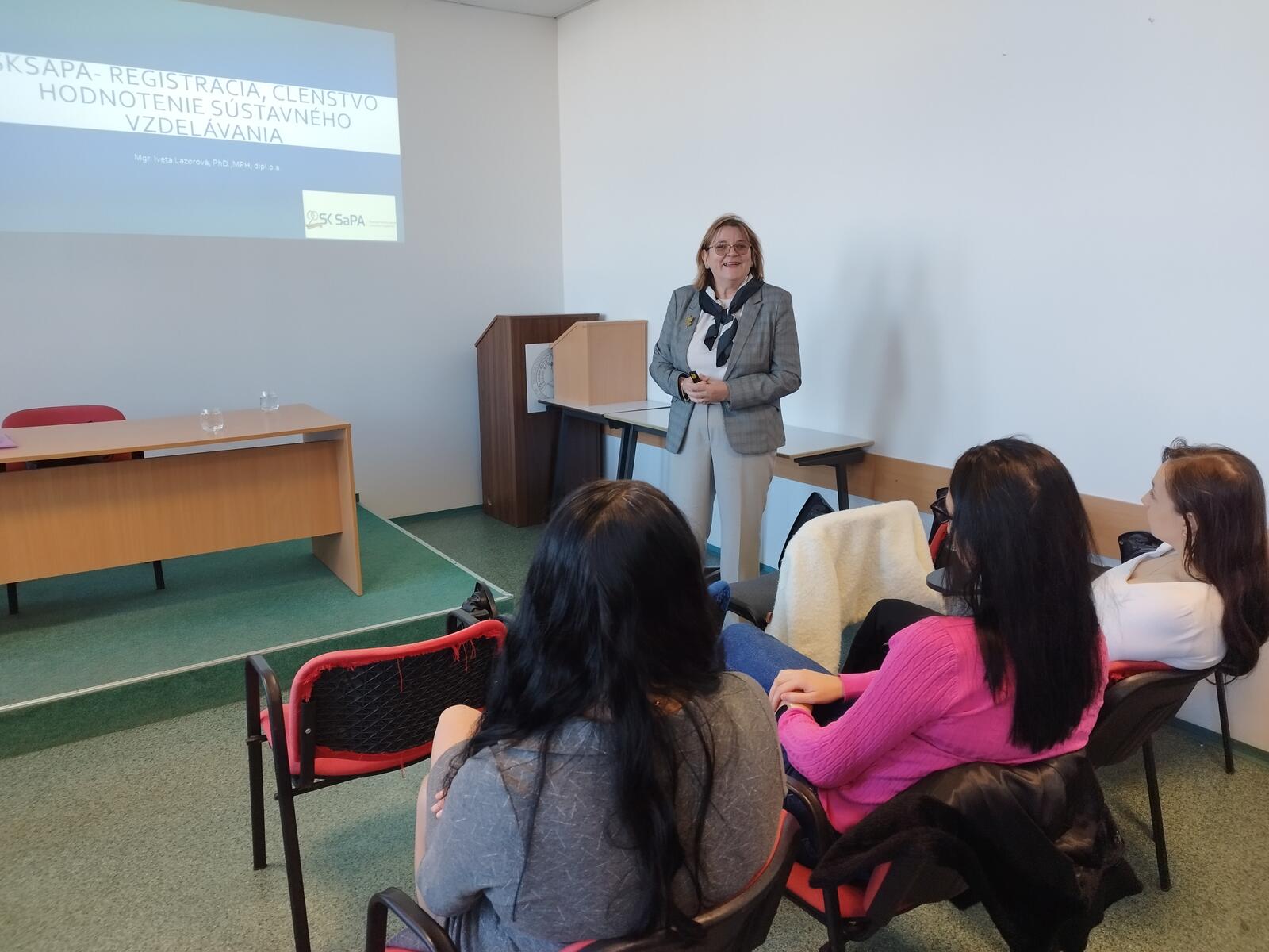 Študentom priblížila činnosť Slovenskej komory sestier a pôrodných asistentiek (SK SaPA) – jej poslanie, ciele, úlohy, proces registrácie, členstvo a členské poplatky. Venovala sa aj spolupráci komory s národnými a medzinárodnými organizáciami, ktoré podporujú rozvoj ošetrovateľstva a pôrodnej asistencie.