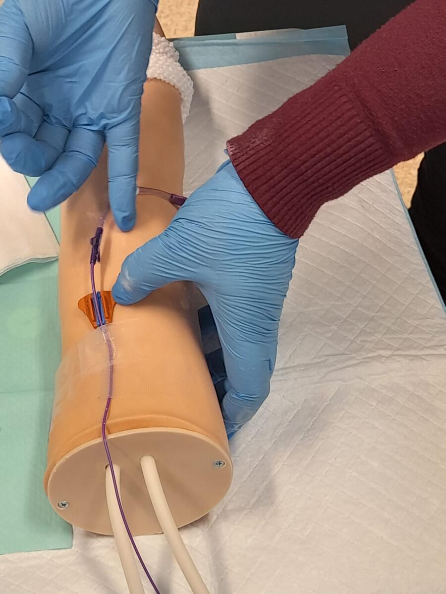 V praktickej časti si precvičili postupy ošetrovania, odber krvi a realizáciu preväzu, pričom využili aj VIP skóre hodnotenia na kontrolu miesta zavedenia periférneho žilového katétra.